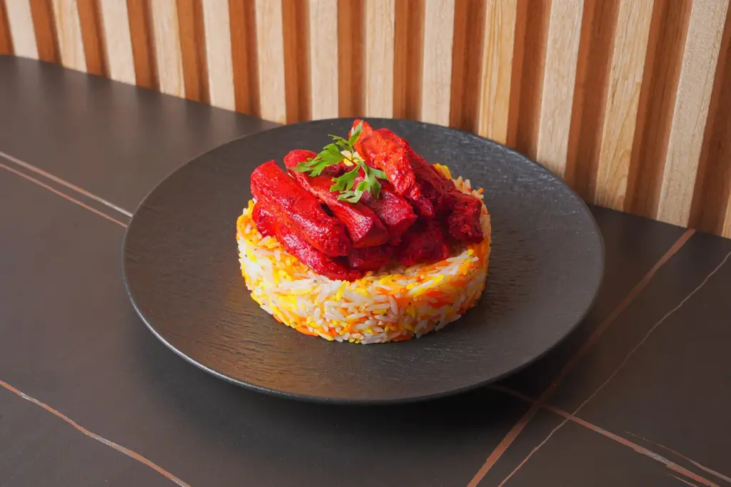 قطع دجاج حمراء بالبهارات مشوية على الطريقة الهندية + 100 جرام أرز